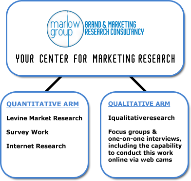 Another unique benefit of the Marlow Group is our Center for Marketing Research where we are privileged to work in partnership with two other outstanding research organizations…one LevineMarketResearch, a full service strategically based market research firm specializing in Quantitative research, andiQualitativeResearch, a firm specializing in focus groups and one-on-one interviews that may be conducted either in person or online with the use of webcams in respondents homes and offices.
